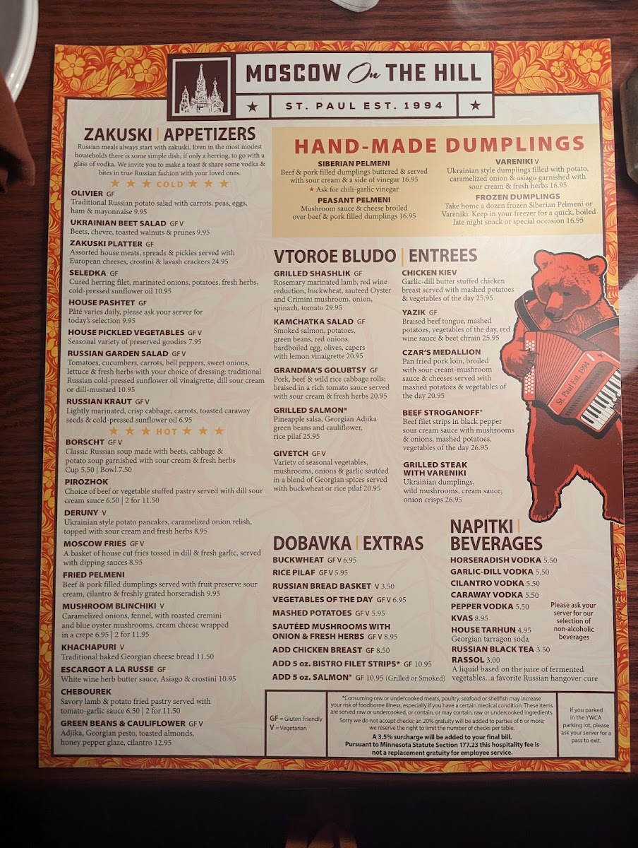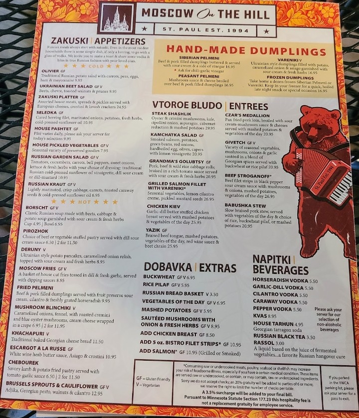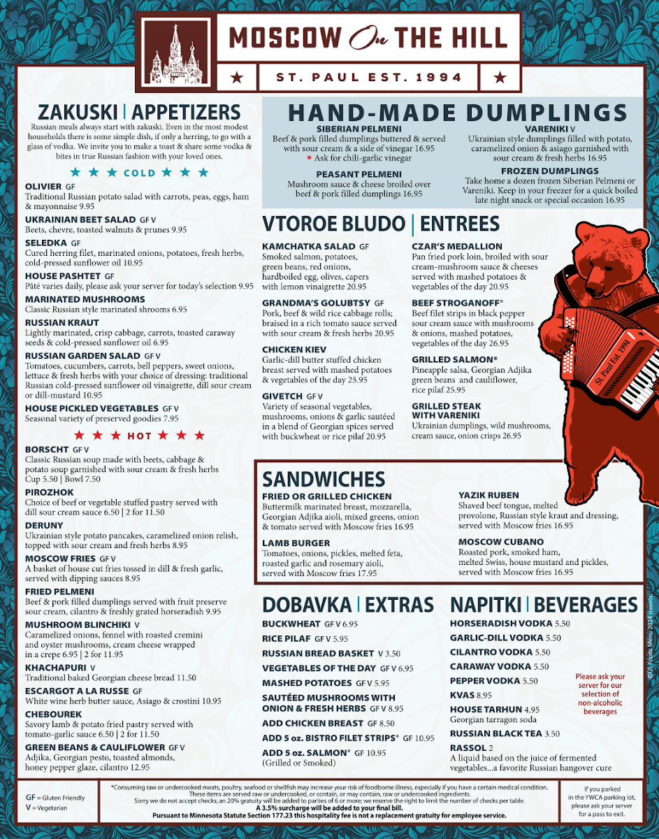 Tomatoes, cucumbers, carrots, bell peppers, sweet onions, lettuce and fresh herbs with your choice of dressing: traditional Russian cold-pressed sunflower oil vinaigrette, dill-sour cream or dill-mustard